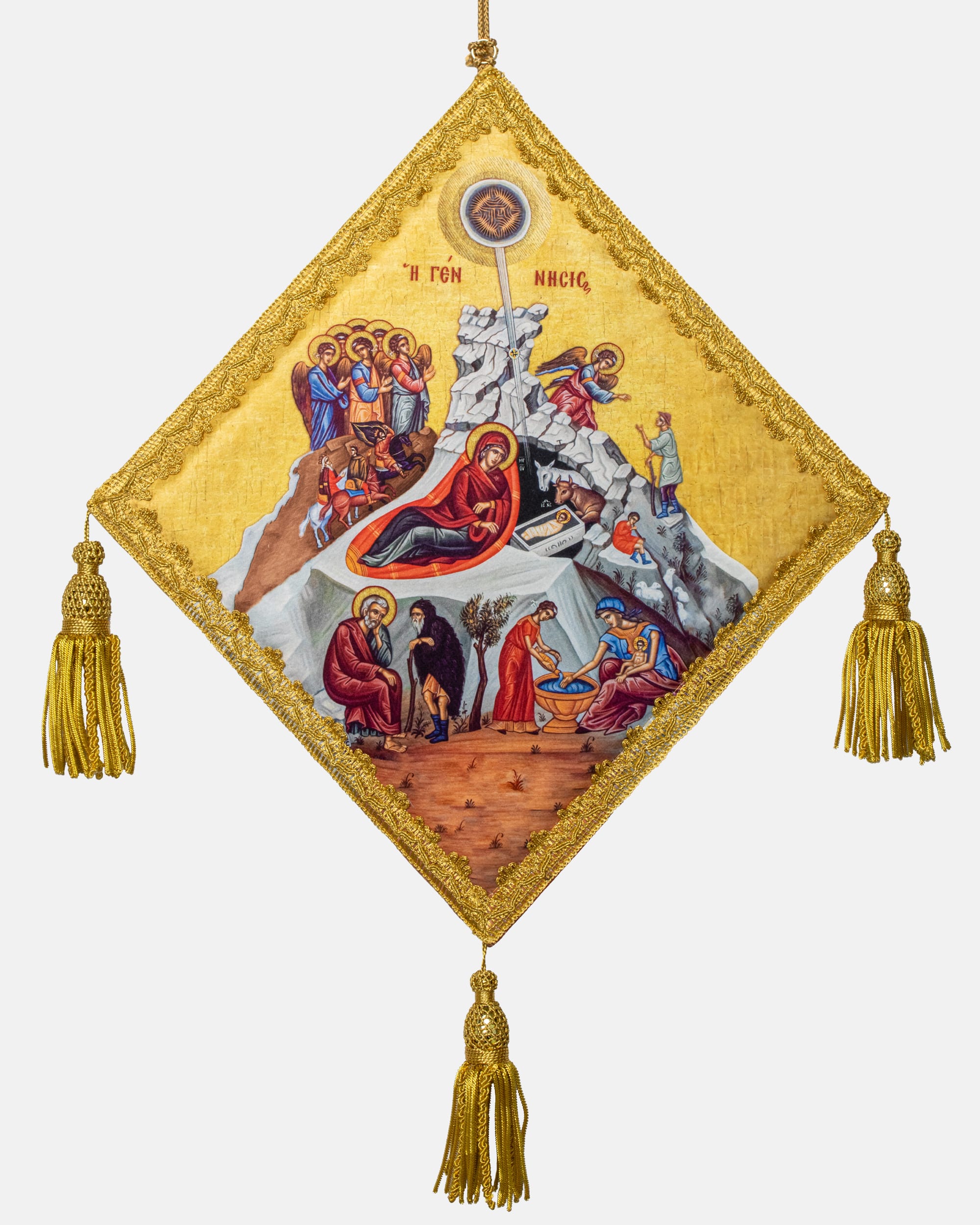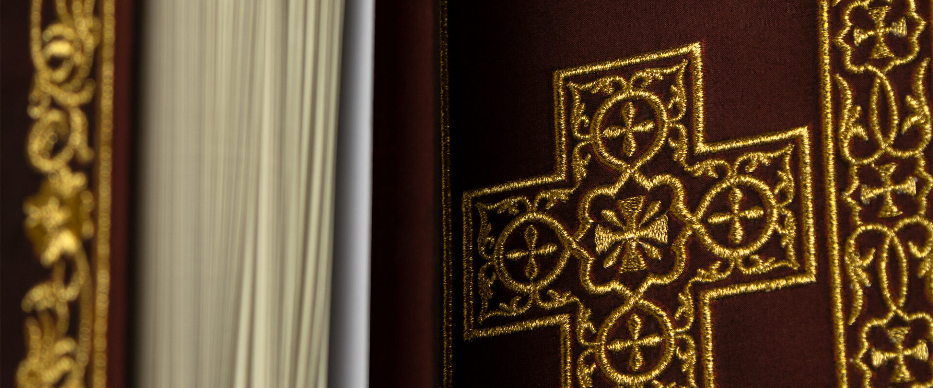 Μπροστινή όψη ιερατικής στολής από ζαχαρί ταφτά με χρυσοκέντητα βυζαντινά ποικίλματα