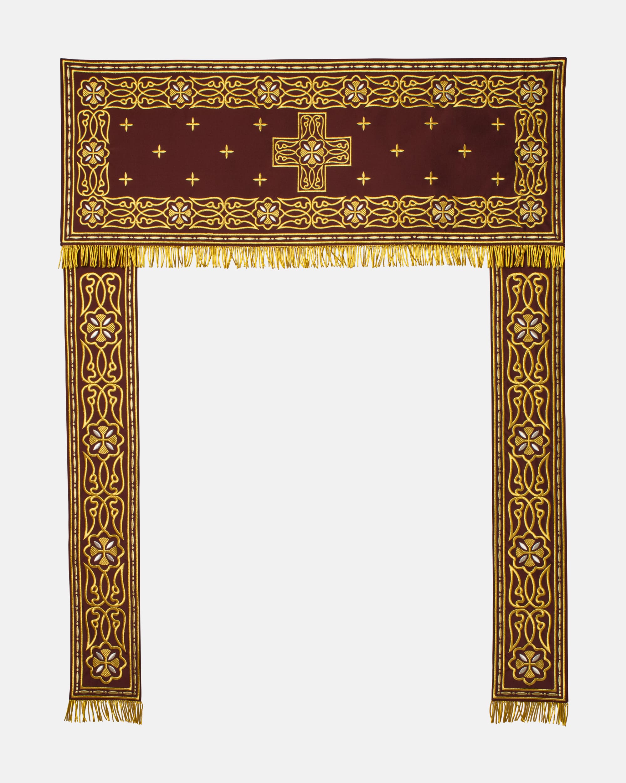 Φορεσιά εικόνας σε μπορντό ταφτά, διακοσμημένη με χρυσοκέντητα βυζαντινά ποικίλματα και χρυσά συρματερά κρόσσια.